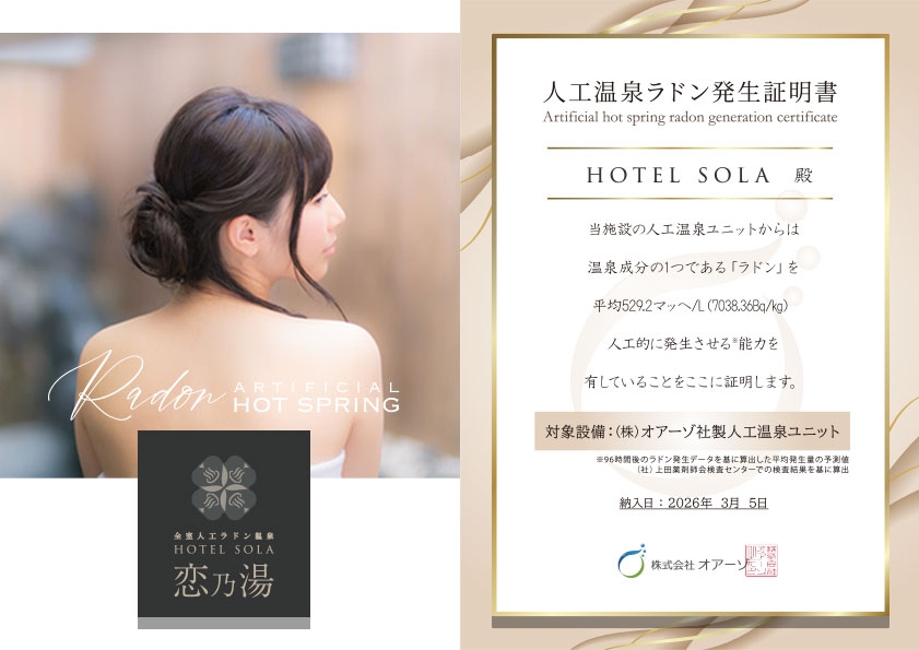 ホテル ソラ「恋乃湯」誕生!全客室に【♨人工ラドン温泉♨】を導入!
